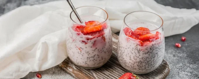 - Όταν η πουτίγκα chia είναι έτοιμη, ανακατέψτε την ξανά. Την αδειάζετε σε φλιτζάνια ή πιάτα, την ολοκληρώνετε με κομμένες φράουλες και γαρνίρετε με δυόσμο.