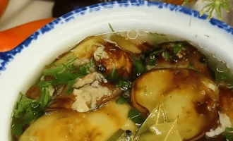 - Μεταφέρετε τα κρεμμύδια και τα μανιτάρια σε μια κατσαρόλα, προσθέστε τις πατάτες σε φέτες, τα μπαχαρικά, ρίξτε ζεστό νερό ή ζωμό. Μαγειρέψτε για 10-12 λεπτά μέχρι να μαλακώσουν οι πατάτες.